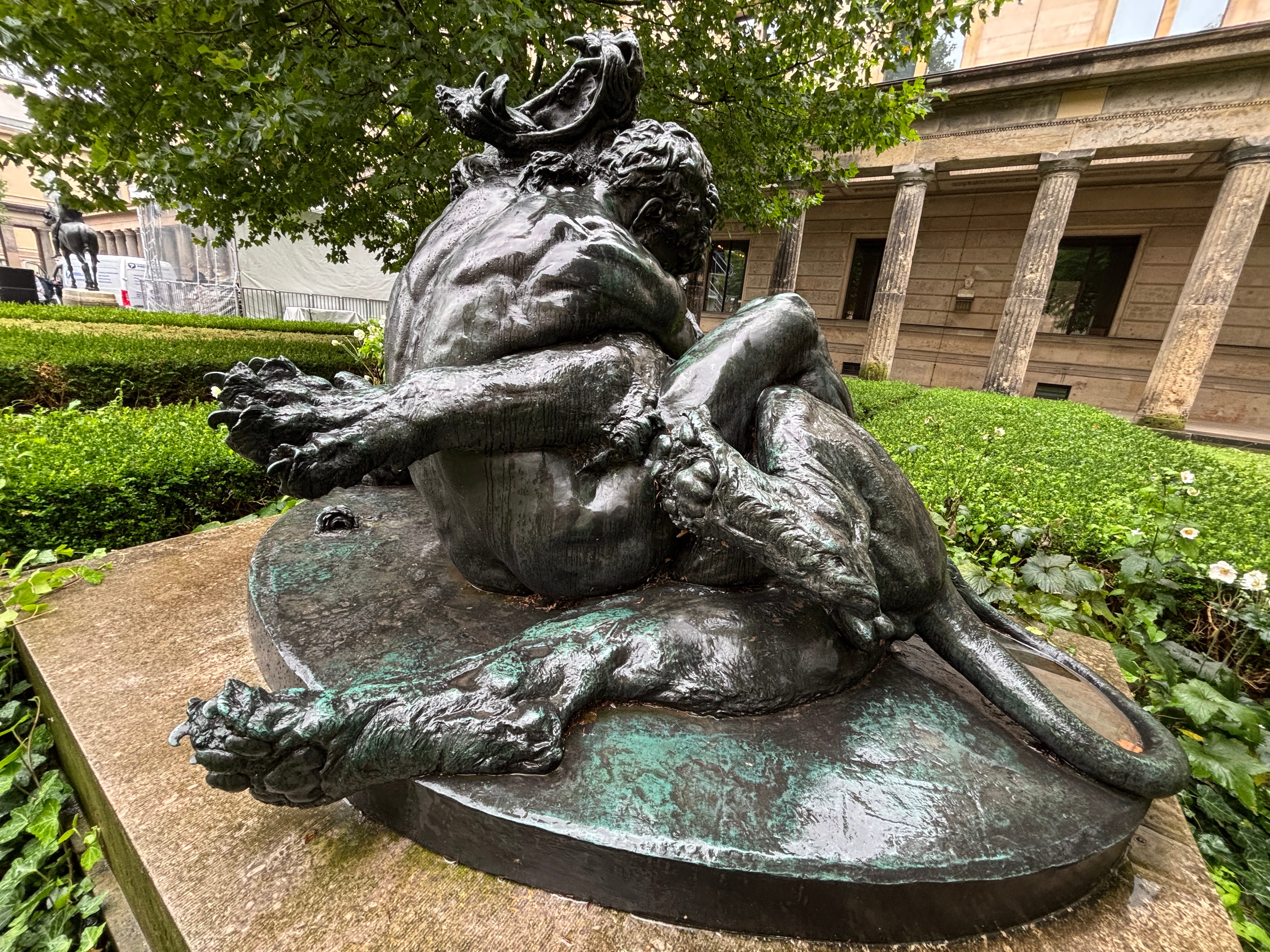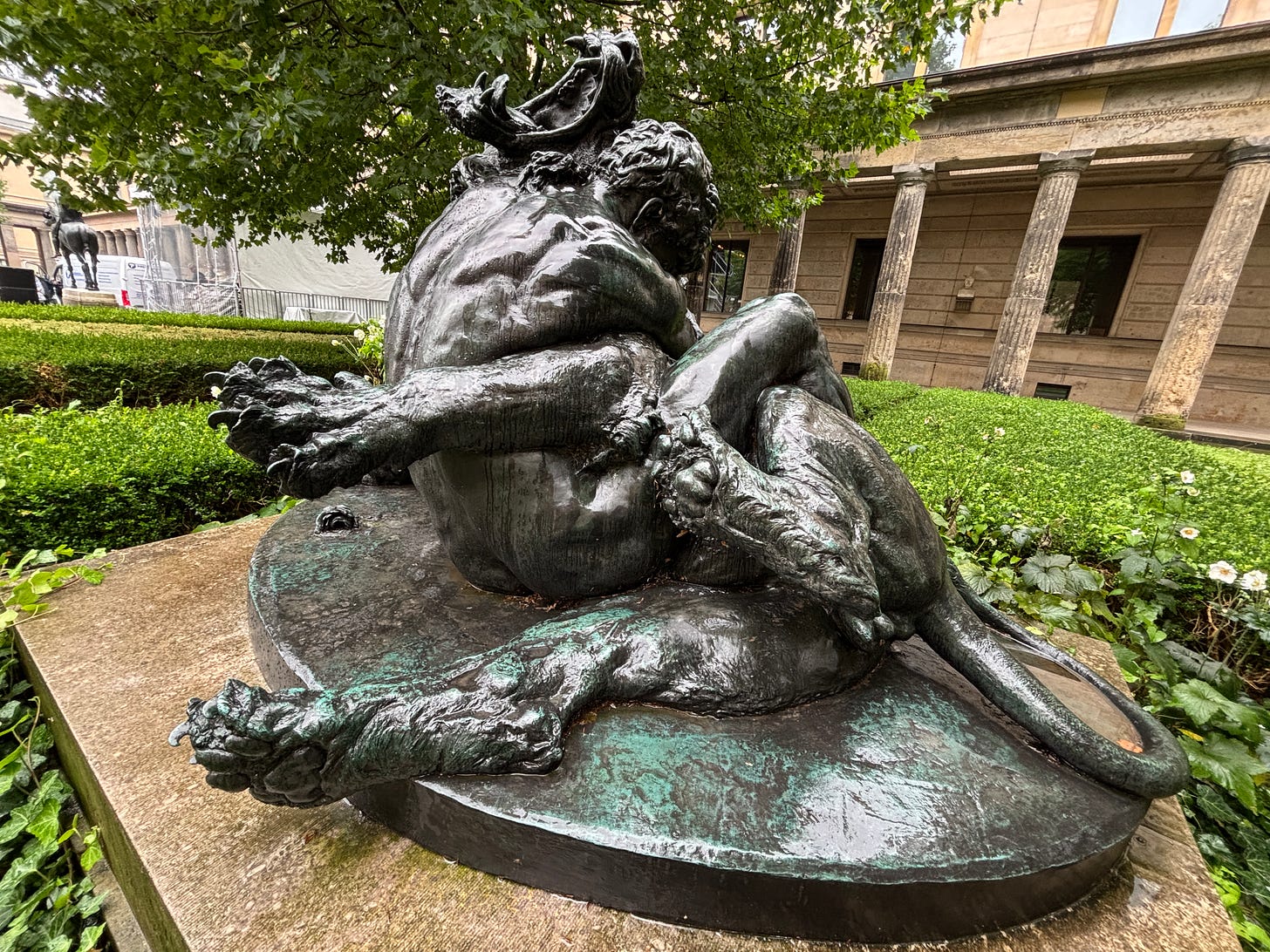 Frizzelle in Berlin with his boyfriend A statue of Herkules — as the Germans spell it — wresting the Nemean Lion in Berlin