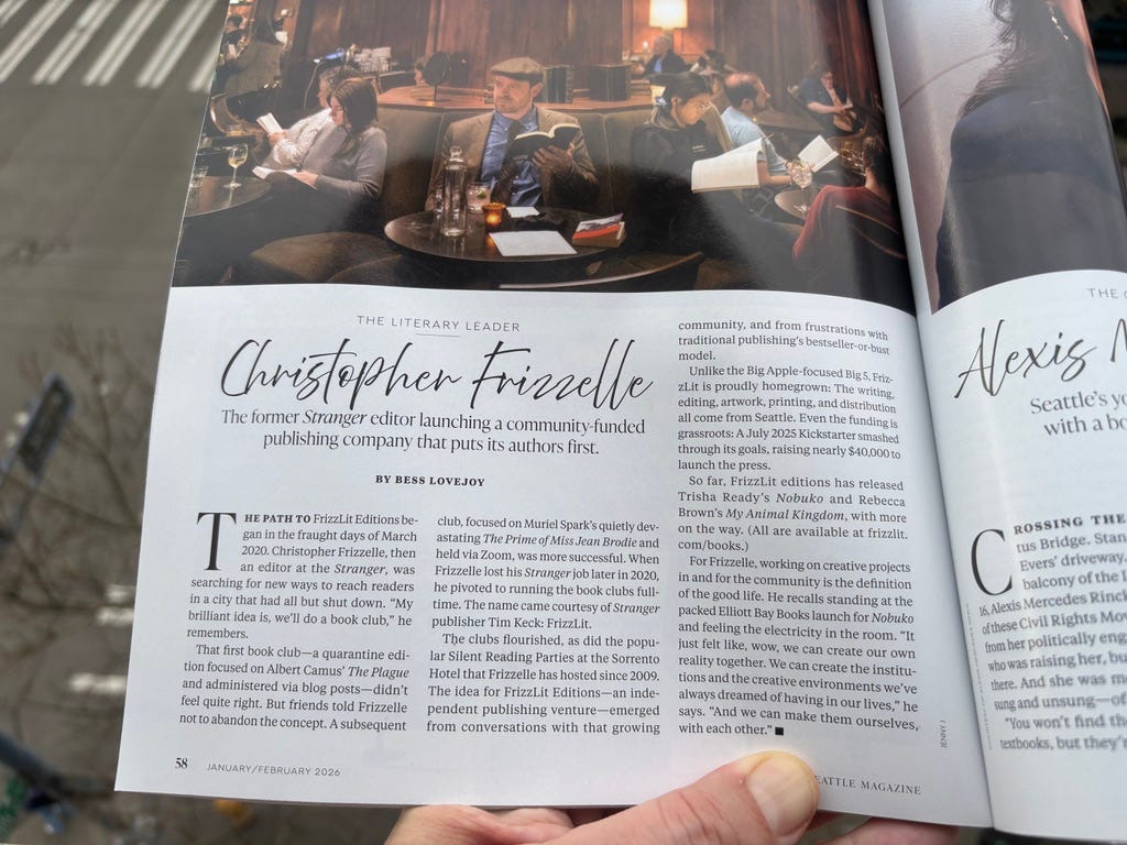 And I’m thrilled that the piece about me—written by Bess Lovejoy—isn’t so much about me as it is about the whole FrizzLit community, from FrizzLit’s genesis five years ago as an online book club reading great books, to the new things we’ve just launched, like our small press FrizzLit Editions.